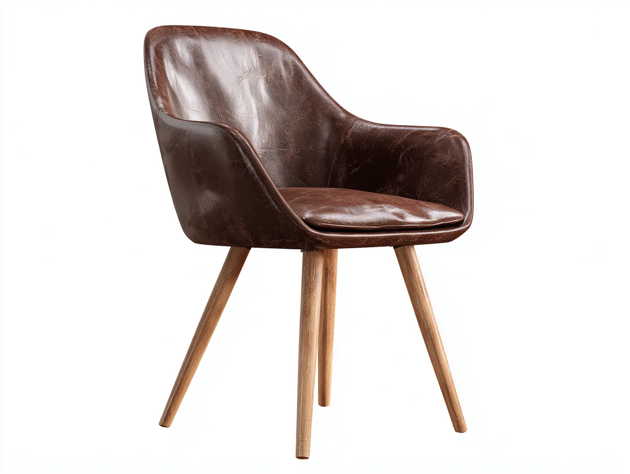 The seat is upholstered in dark brown leather with a naturally textured surface, giving it a rich and distinctive appearance. The solid wood legs provide stable support and showcase a warm natural grain that complements the upholstery.