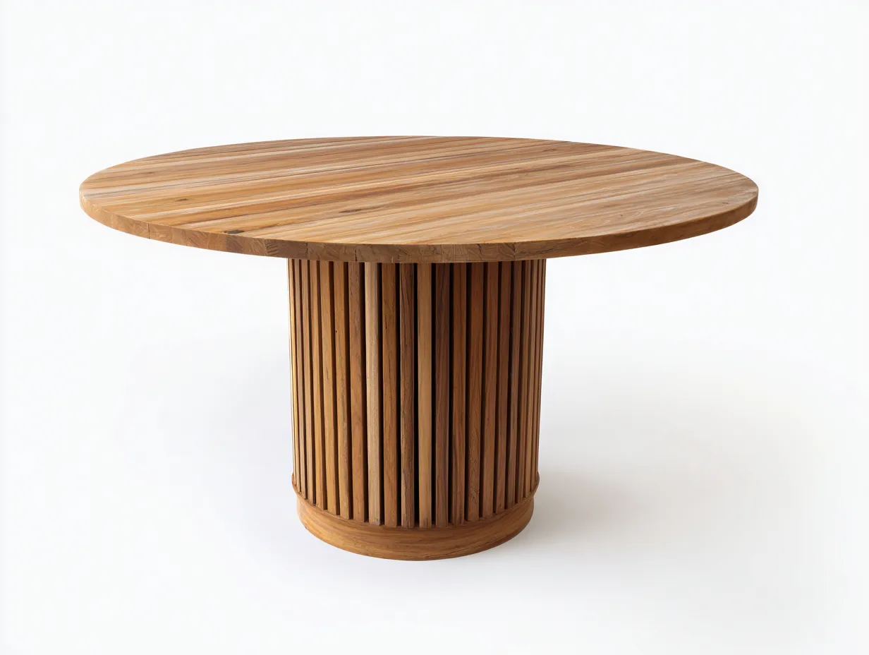 The round tabletop supports practical use and easy interaction. The cylindrical slatted base design offers strong support while adding a refined visual texture making it suitable for contemporary outdoor environments.